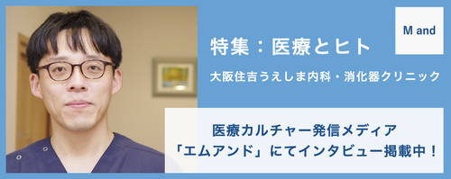 大阪住吉うえしま内科・消化器クリニックは、総合内科・消化器内科・内視鏡内科・肝臓内科を備えたクリニックです。各診療科の専門医としての知識、中核病院で培った経験を活かして、専門的かつ丁寧な診療を行います。内視鏡内科では、苦痛の少ない胃カメラ検査・大腸カメラ検査に対応し、がんをはじめとする消化器疾患の早期発見・早期治療に努めます。お困りの事がありましたら、いつでも当院にご相談ください。
